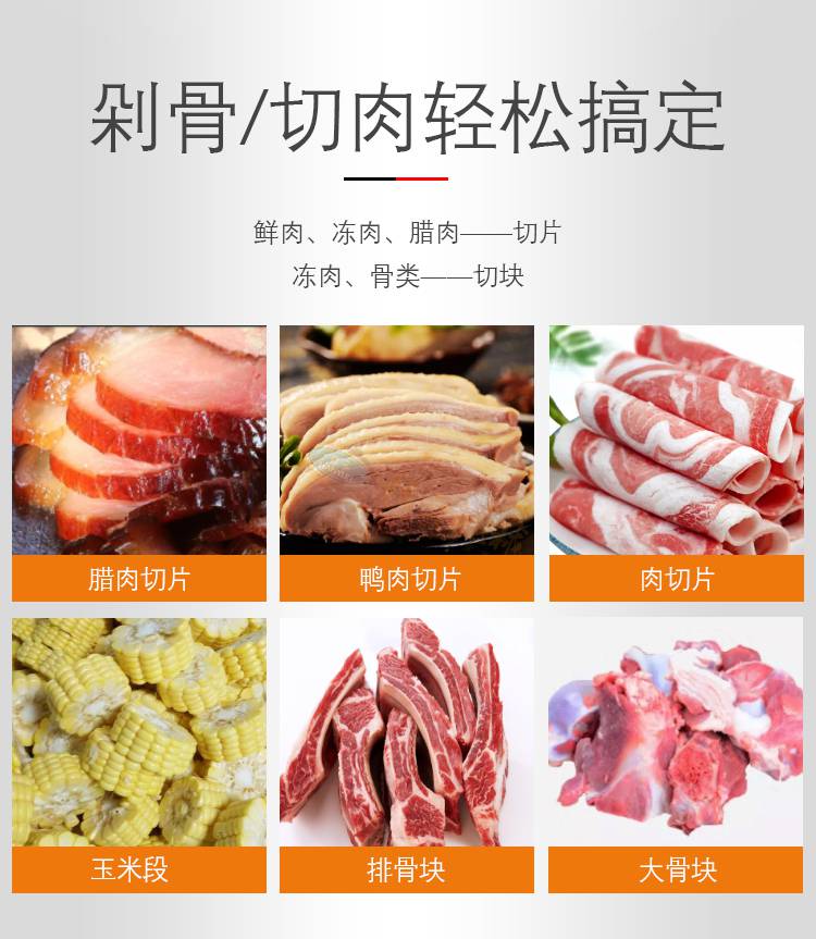 1:这款设备不仅可以对鲜肉,熟肉,冻肉切割成片,还可以切玉米,黄瓜,萝卜等根茎类果蔬;更换锯齿组还可以用于冻肉骨,带骨禽类进行剁骨,切块加工工序;一机多用,省时省力;