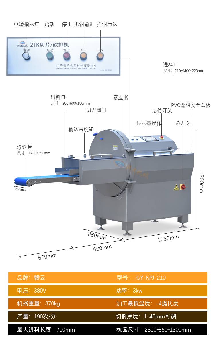 2:赣云210智能砍排机切片厚薄均匀,切块大小统一;适用于各大中小型肉制品加工厂,冷冻食品加工厂,肉联厂,半成品配送中心,高校食堂,职工食堂,酒店厨房,中餐店,西餐店等餐饮服务单位;