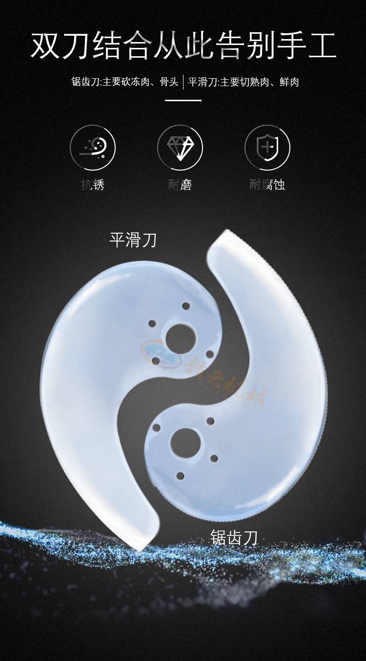 3:赣云210型智能砍排机整体机身采用304加厚不锈钢精心制作,外表美观大方,***,清洗方便,不易腐蚀;锯齿组用于切割冻肉骨和带骨禽类;平滑组用于切割熟肉,鲜肉,根茎类果蔬;组拆卸简单,更换方便,清洗方便,锋利***,***,维护***降低;